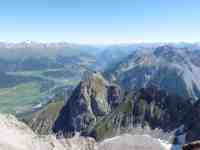 Vorne im Bild, der höchste Punkt des Piz Lischana, ist felssturzgefährdet. Links die Ötztaler Alpen. Rechts die Ortlergruppe.  |